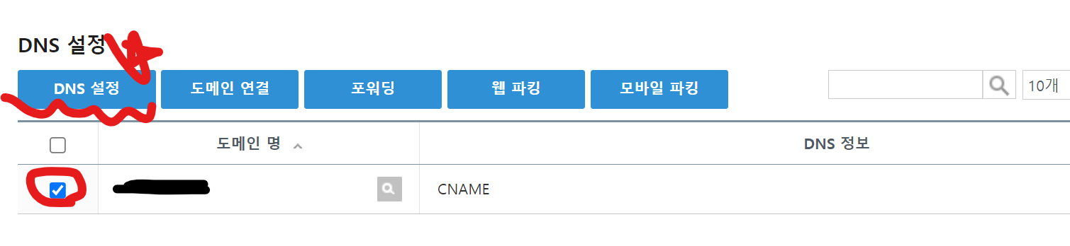 이어서 구매한 도메일은 선택한 뒤에 <DNS 설정> 버튼을 눌러준다.