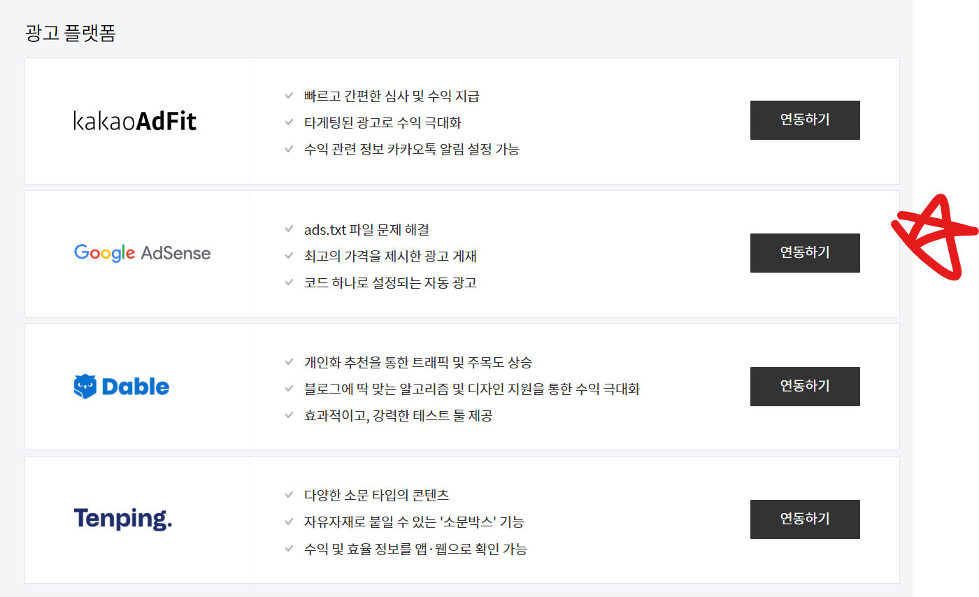광고 플랫폼에서 구글 애드센스 <연동하기>를 눌러주고