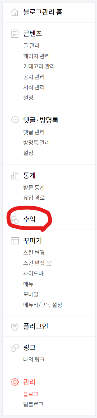 다시 블로그 관리 홈에 들어가 <수익> 탭을 눌러 준다.